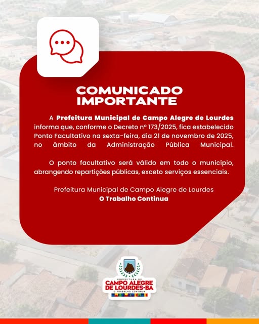 A Prefeitura Municipal de Campo Alegre de Lourdes informa que, conforme o Decreto nº 173/2025, o dia 21 de novembro (sexta-feira) será ponto facultativo no âmbito da Administração Pública Municipal.