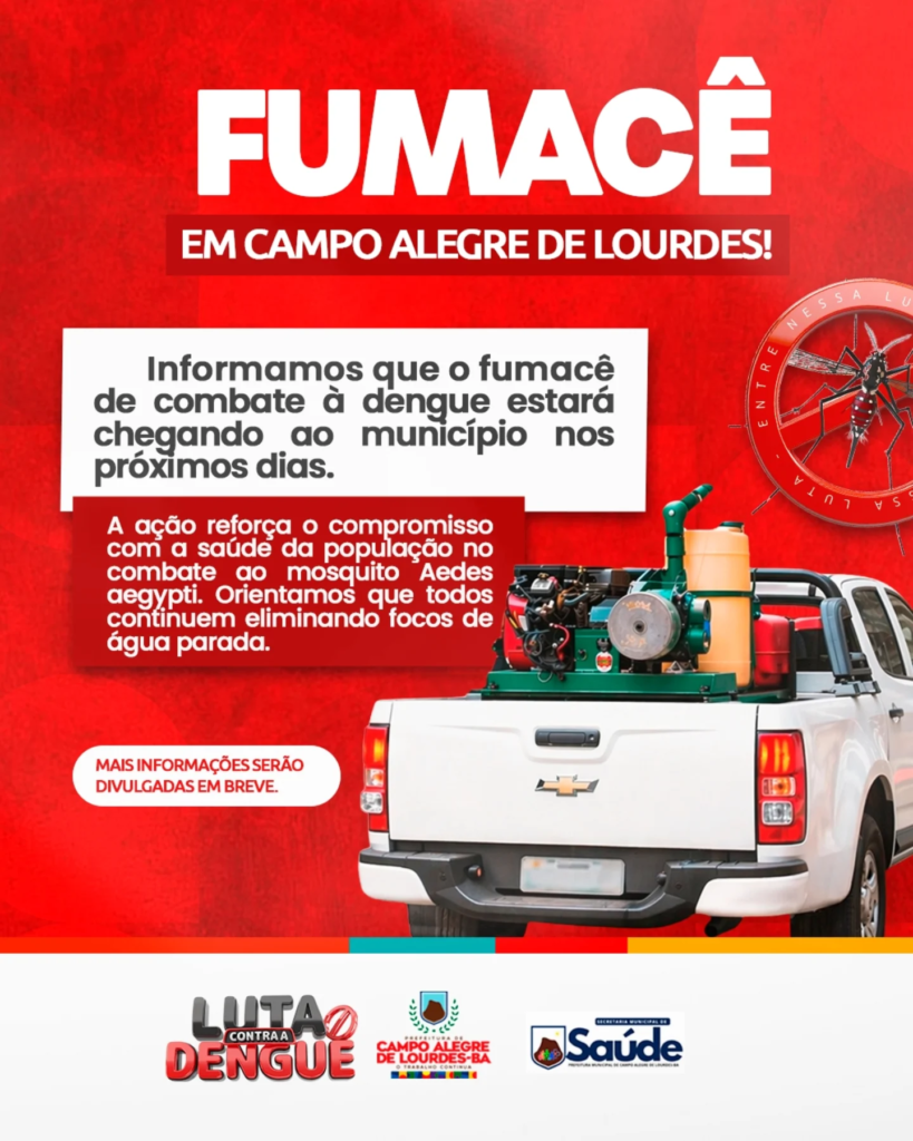 A Prefeitura Municipal de Campo Alegre de Lourdes, através da Secretaria Municipal de Saúde, informa que o fumacê de combate à dengue estará chegando ao município nos próximos dias.