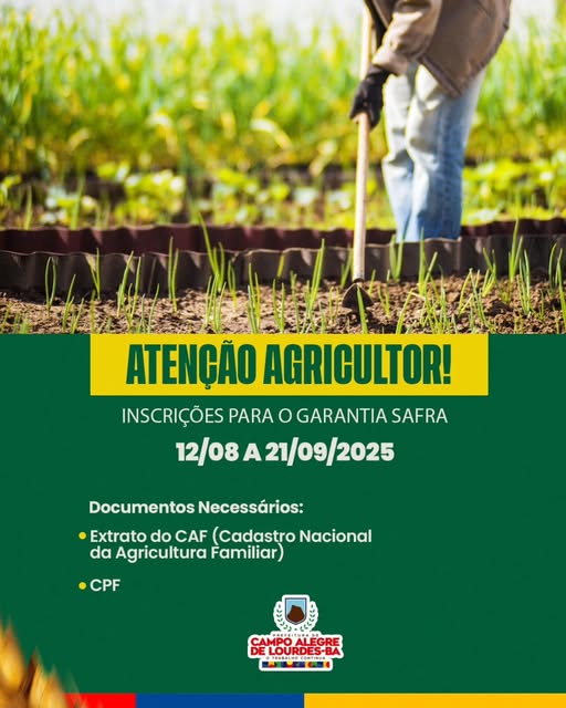 A Prefeitura Municipal informa que estarão abertas, de 12 de agosto a 21 de setembro, as inscrições para o Garantia-Safra.