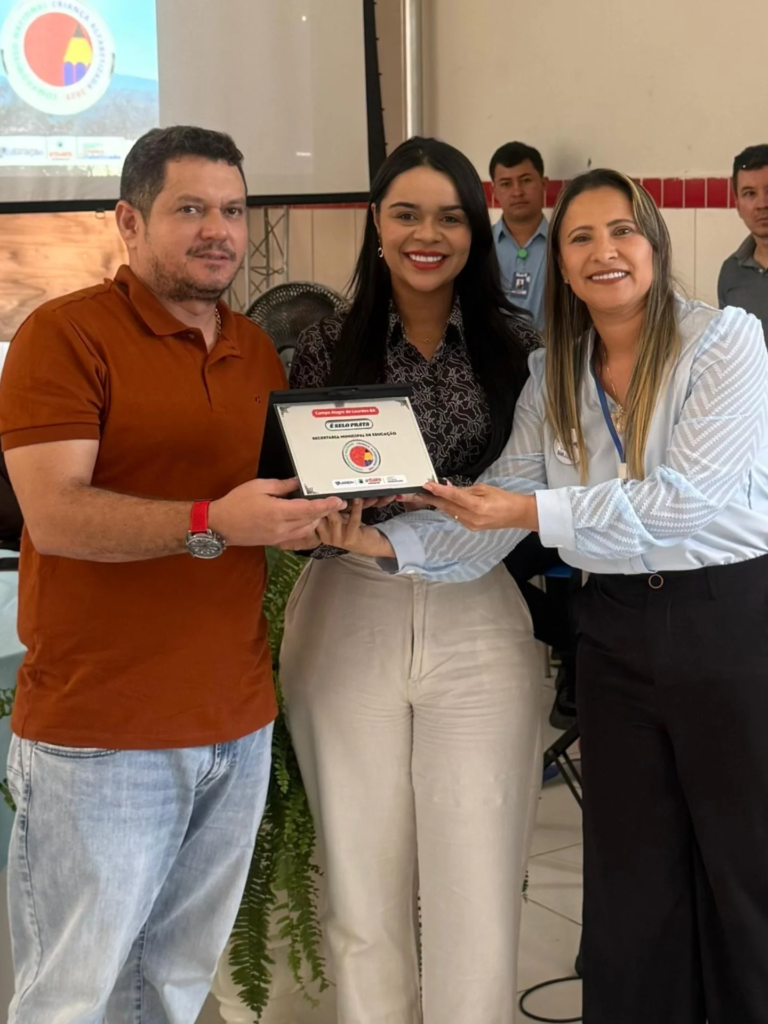 Durante a programação, um dos momentos mais marcantes foi o recebimento da placa do Selo Prata de Alfabetização, reconhecimento que celebra o empenho e os resultados alcançados pela rede municipal no fortalecimento da alfabetização das crianças.