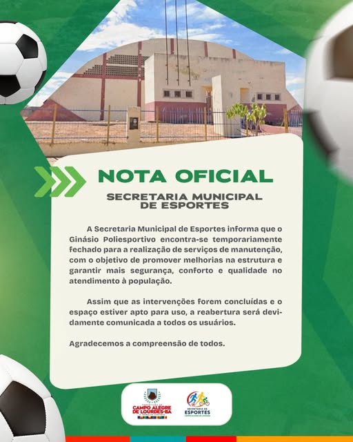 A Secretaria Municipal de Esportes informa que o Ginásio Poliesportivo está temporariamente fechado para manutenção, visando oferecer um espaço mais seguro e adequado para todos.