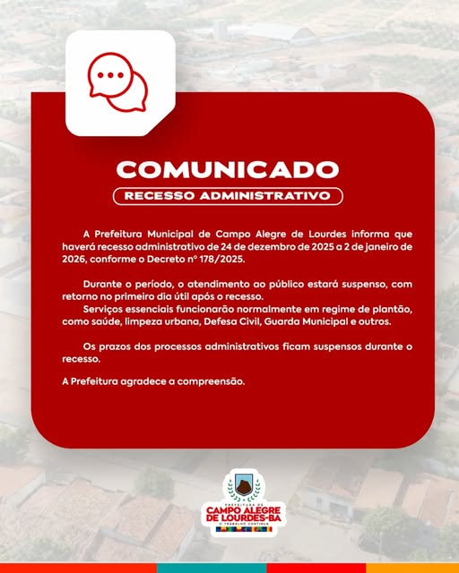 A Prefeitura Municipal de Campo Alegre de Lourdes informa que haverá recesso administrativo de 24 de dezembro de 2025 a 2 de janeiro de 2026, conforme o Decreto nº 178/2025.